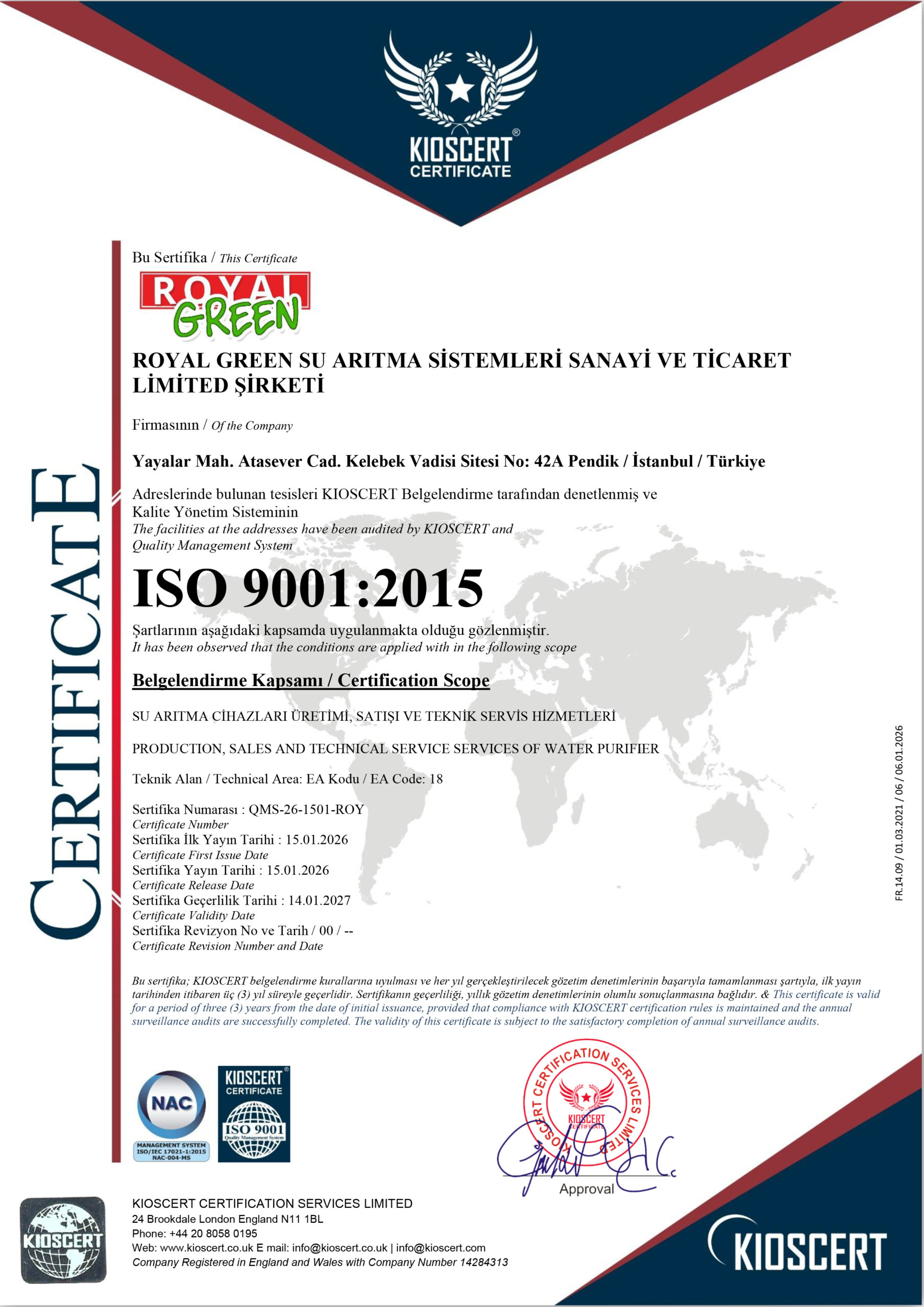 Royal Green Su Arıtma Firma Sertifikaları